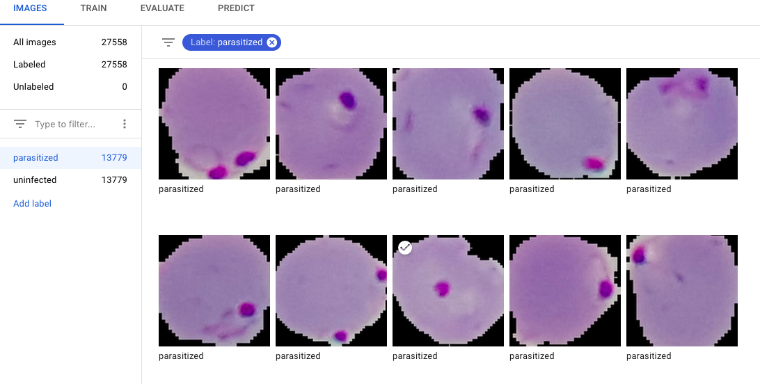 It will take a little while for AutoML to import all of your images. Once it’s complete, you should see the AutoML UI come back and show you samples of all of your images, and some stats like the number images labeled as parasitized and uninfected.