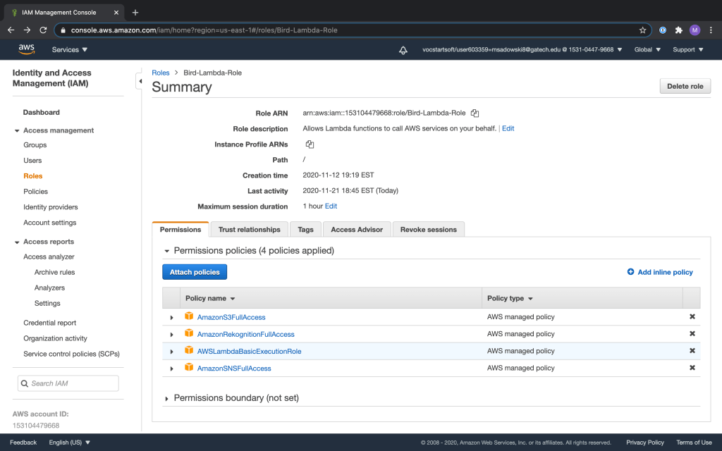To create a Lambda, first, you need to create a role that the Lambda will assume, with rights to S3, Lambda, Rekognition, and SNS. Go to IAM in the AWS console, and create a new role and give it the following policies: