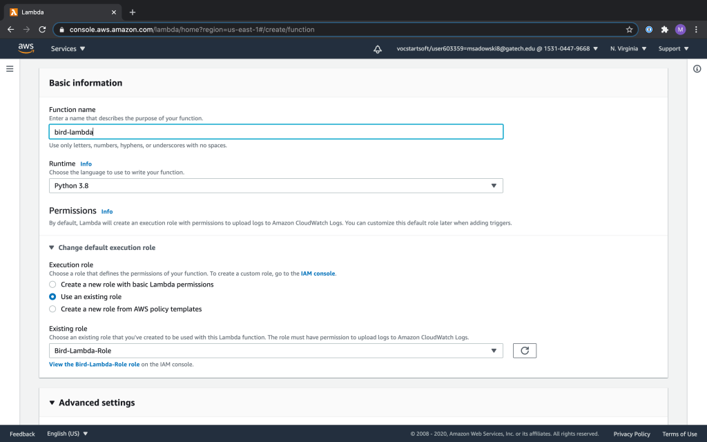 Then go to Lambda in the AWS console. Click Create Function, and choose Author From Scratch. Name your Lambda, and choose Python 3.8 as your language, and be sure to give it the role you created earlier so it can access S3, Rekognition, and SNS.