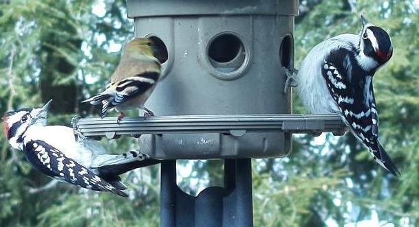 I think these are downy woodpeckers (plus a goldfinch)